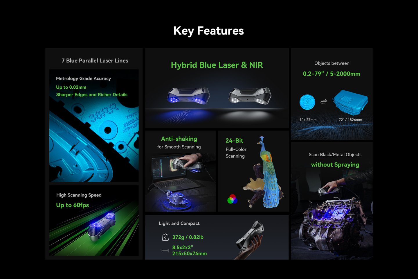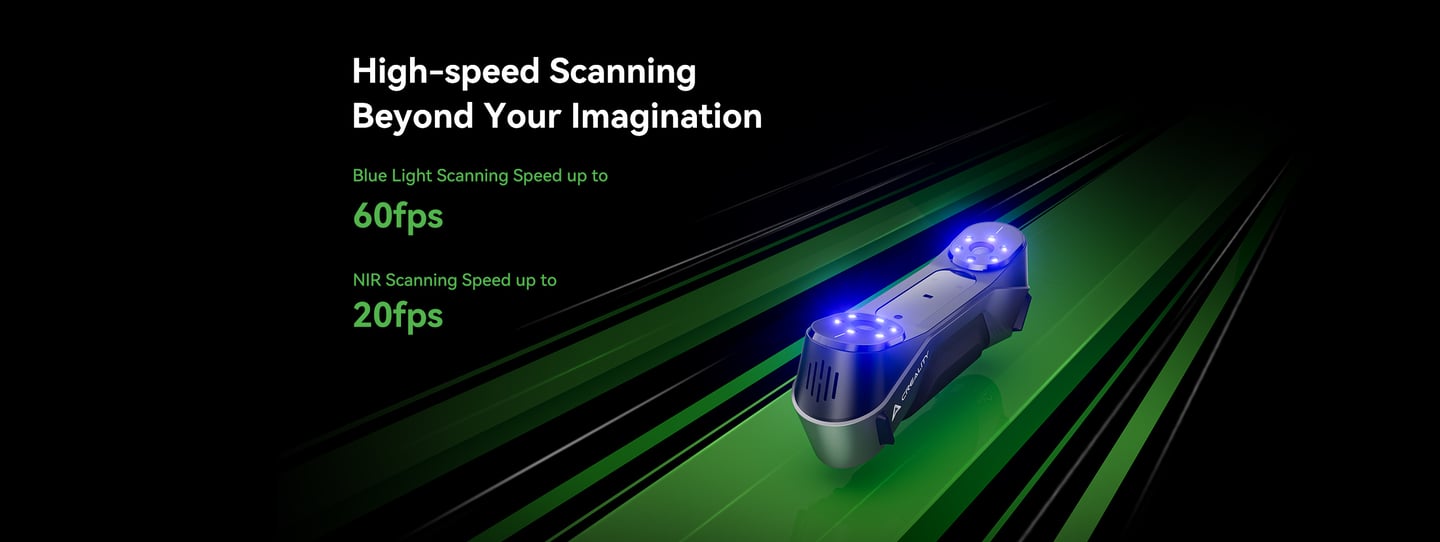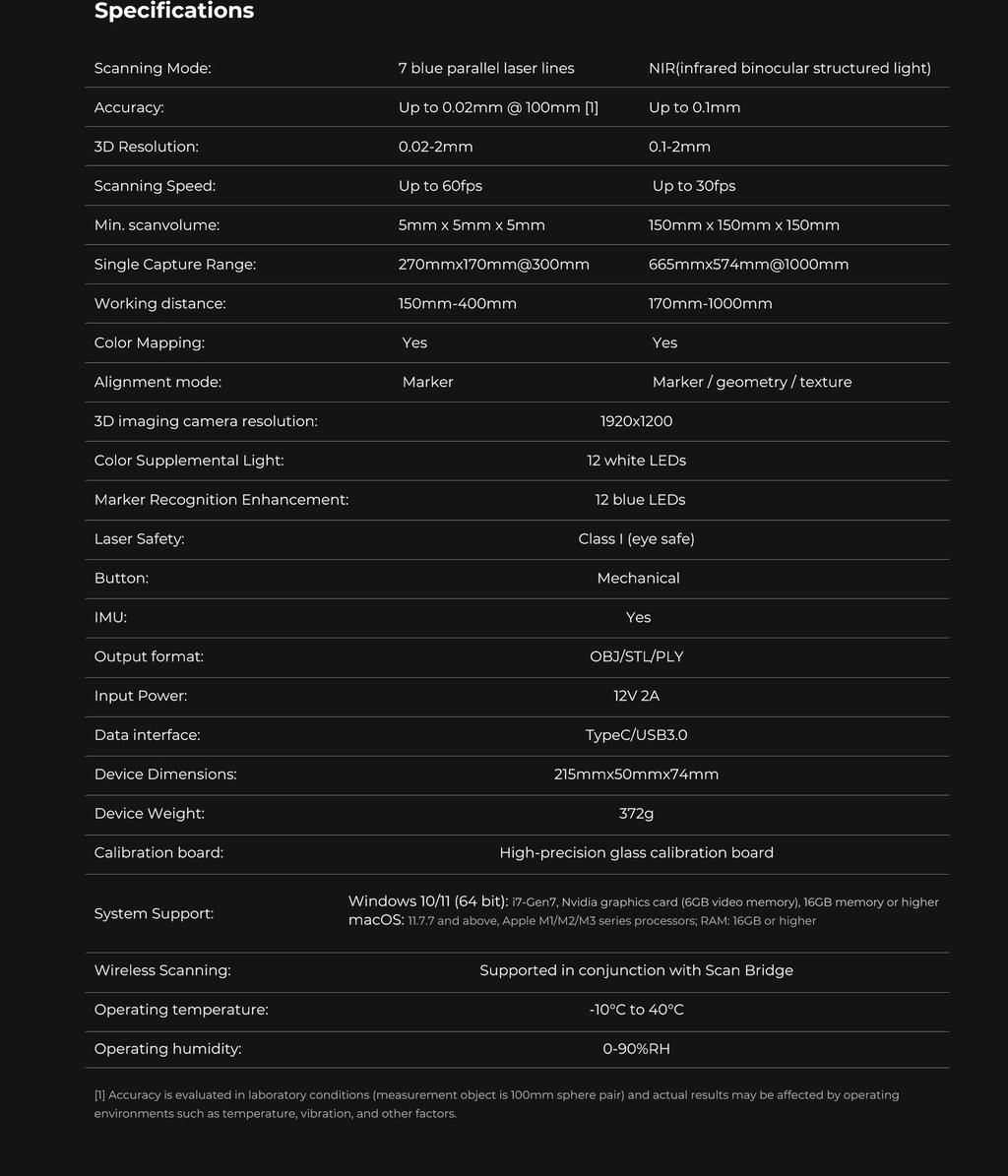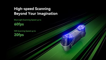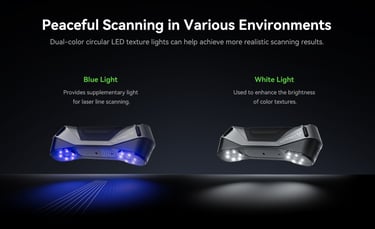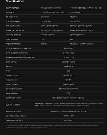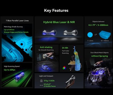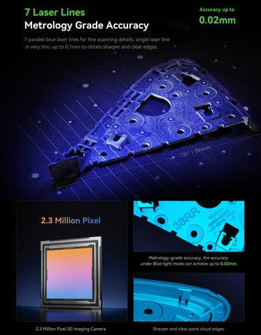 The first Multiple-line Blue Lase Consumer 3D Scanner with Hybrid Blue Laser & NOR, Metrology Grade Accuracy. Reliable Accuracy up to 0.02mm, Objects between 5-2000mm scan