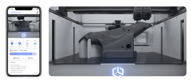 Camera control technology allow customers to control printing process on speed,pause,temp.,etc., with an APP remotely, achieving the best printing quality with shortest time without failure. A very useful feature on large model and long time printing.